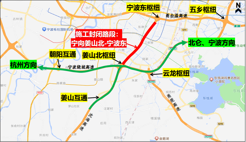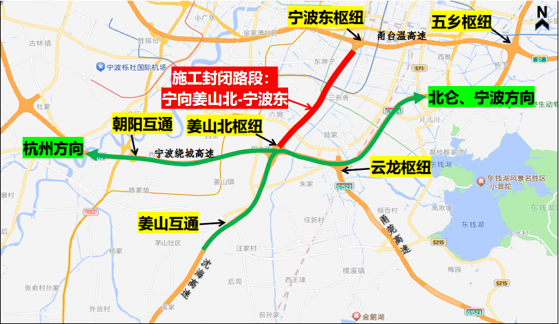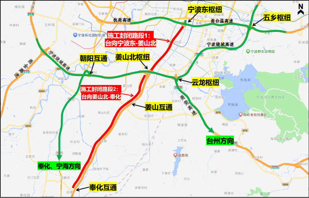 S1甬台温高速宁波东枢纽-姜山北枢纽双向、G15沈海高速台州方向姜山北枢纽-奉化互通实行封闭道路施工,宁波东枢纽转S1甬台温高速台州方向匝道关闭,G1504宁波绕城高速姜山北枢纽双向转S1甬台温高速双向匝道关闭,鄞州南收费站往台州方向进口匝道关闭。
