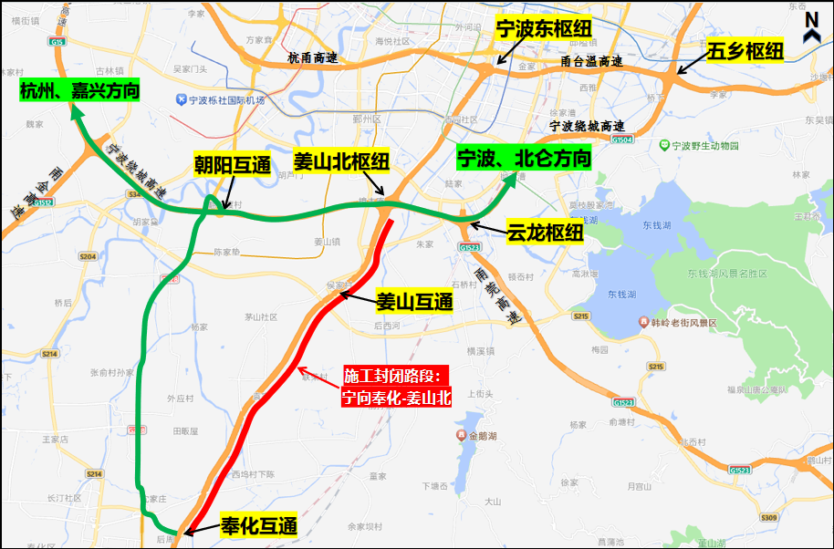 G15沈海高速宁波方向奉化互通-姜山北枢纽实行封闭道路施工,奉化、鄞州南收费站往宁波方向进口匝道关闭。