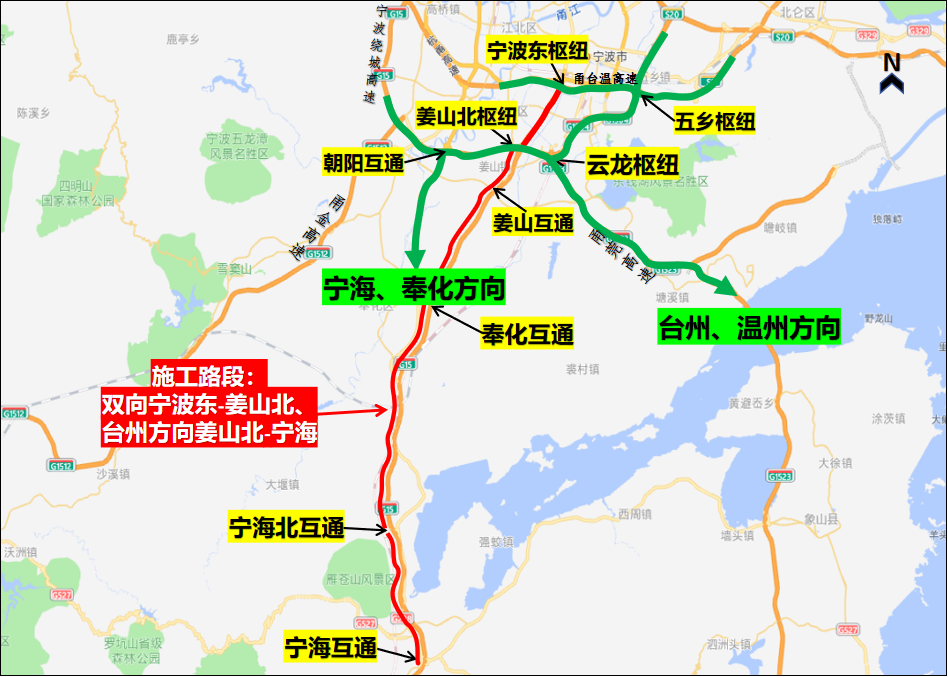 S1甬台温高速宁波东枢纽-姜山北枢纽双向、G15沈海高速台州方向姜山北枢纽-宁海互通实行封闭道路施工,宁波东枢纽转S1甬台温高速台州方向匝道关闭,G1504宁波绕城高速姜山北枢纽双向转S1甬台温高速双向匝道关闭,鄞州南、奉化、宁海北收费站往台州方向进口匝道关闭,台州方向奉化、宁海服务区关闭。