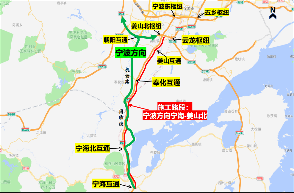 G15沈海宁波方向宁海互通-姜山北枢纽实行封闭道路施工,宁海、宁海北、奉化、鄞州南收费站往宁波方向进口匝道关闭,宁波方向宁海、奉化服务区关闭。