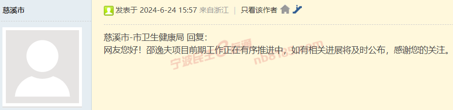 上个月,慈溪市卫生健康局在民生e点通上公开回复说,“邵逸夫项目前期工作正在有序推进中”。