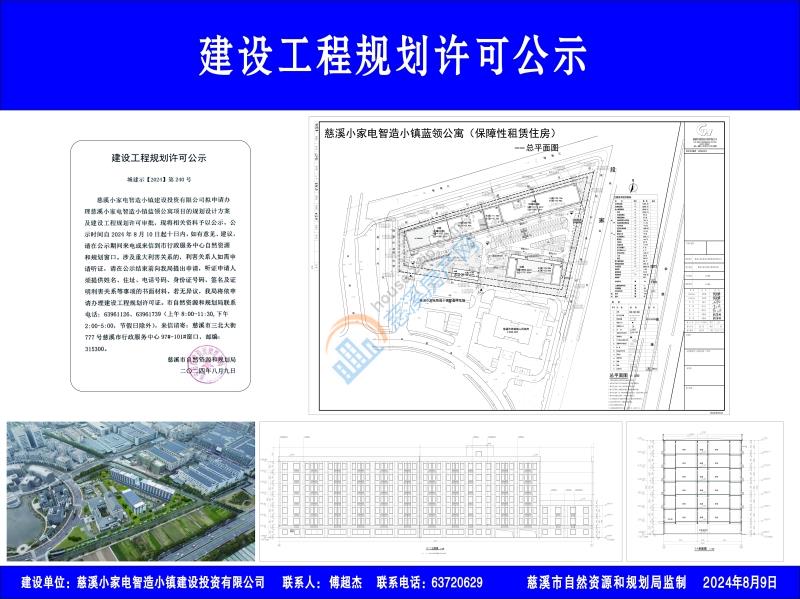 慈溪小家电智造小镇建设投资有限公司拟申请办理慈溪小家电智造小镇蓝领公寓项目的规划设计方案及建设工程规划许可审批,现将相关资料予以公示。公示时间自2024年8月10日起十日内,如有意见、建议,请在公示期间来电或来信到市行政服务中心自然资源和规划窗口。涉及重大利害关系的,利害关系人如需申请听证,请在公示结束前向我局提出申请,听证申请人须提供姓名、住址、电话号码、身份证号码、签名及证明利害关系等事项的书面材料。若无异议,我局将依申请办理建设工程规划许可证。市自然资源和规划局联系电话:63961126、63961739(上午8:00-11:30,下午2:00-5:00,节假日除外),来信请寄:慈溪市三北大街777号慈溪市行政服务中心97#-101#窗口,邮编:315300。