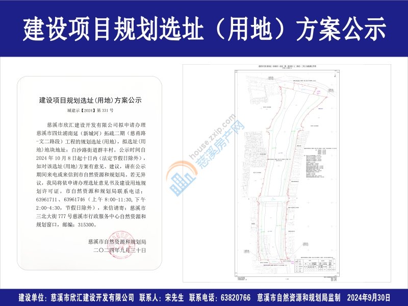 慈溪市欣汇建设开发有限公司拟申请办理慈溪市四灶浦南延(新城河)拓疏二期(慈甬路-文二路段)工程的规划选址(用地),拟选址(用地)地块地址:白沙路街道群丰村。公示时间自2024年10月8日起十日内(法定节假日除外),如对该选址(用地)方案有意见、建议,请在公示期间来电或来信到市自然资源和规划局。若无异议,我局将依申请办理选址意见书及建设用地规划许可证。市自然资源和规划局联系电话:63961711、63961746(上午8:00-11:30,下午2:00-4:30,节假日除外),来信请寄:慈溪市三北大街777号慈溪市行政服务中心自然资源和规划窗口,邮编:315300。