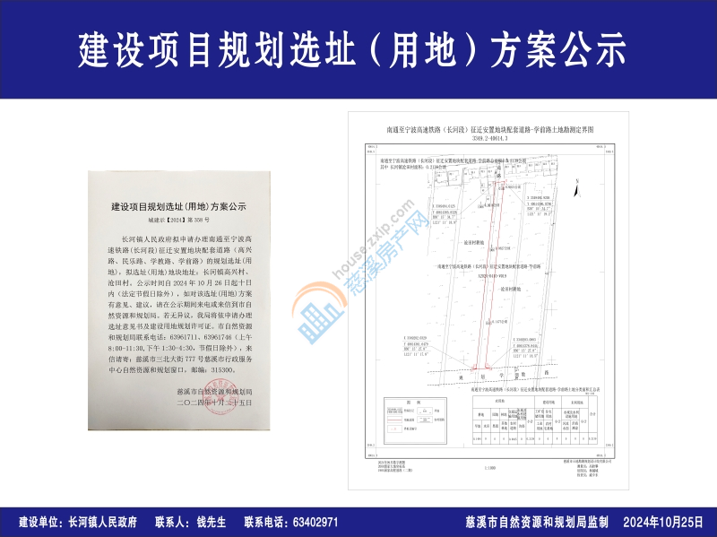 长河镇人民政府拟申请办理南通至宁波高速铁路(长河段)征迁安置地块配套道路(高兴路、民乐路、学教路、学前路)的规划选址(用地),拟选址(用地)地块地址:长河镇高兴村、沧田村。公示时间自2024年10月26日起十日内(法定节假日除外),如对该选址(用地)方案有意见、建议,请在公示期间来电或来信到市自然资源和规划局。若无异议,我局将依申请办理选址意见书及建设用地规划许可证。市自然资源和规划局联系电话:63961711、63961746(上午8:00-11:30,下午1:30-4:30,节假日除外),来信请寄:慈溪市三北大街777号慈溪市行政服务中心自然资源和规划窗口,邮编:315300。