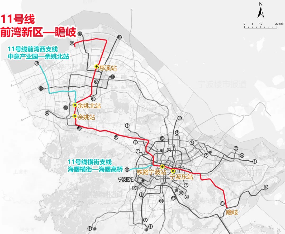 11号线主线,含宁波-余慈线,起点为前湾新区、终点为鄞州瞻岐。另规划有2条支线,分别为中意产业园-余姚北站的前湾西支线、海曙横街-海曙高桥的横街支线。图示如下: