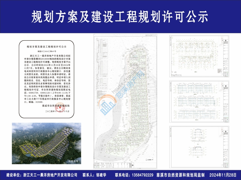 浙江天工一晨洋房地产开发有限公司拟申请办理慈横河I201809#地块的规划设计方案及建设工程规划许可调整,现将规划方案予以公示。公示时间自2024年11月28日至2024年12月7日,如有意见、建议,请在公示期间来电或来信到市行政服务中心规划窗口。涉及重大利害关系的,利害关系人如需申请听证,请在公示结束前向我局提出申请,听证申请人须提供姓名、住址、电话号码、身份证号码、签名及证明利害关系等事项的书面材料。若无异议,我局将依申请办理规划设计方案及建设工程规划许可证。市自然资源和规划局联系电话:63961739、63961126(上午8:00-11:30,下午1:30-4:30,节假日除外),来信请寄:慈溪市三北大街777号慈溪市行政服务中心规划窗口,邮编:315300。