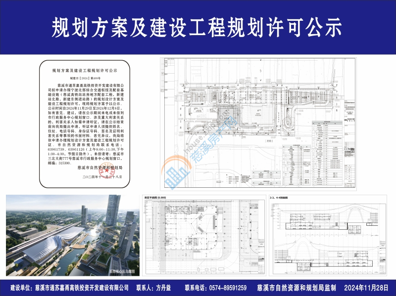 慈溪市通苏嘉甬高铁投资开发建设有限公司拟申请办理宁波北部综合交通枢纽及配套基础设施(慈溪高铁站站房地方配套工程,新建站北路,新建东侧进站路)的规划设计方案及建设工程规划许可,现将规划方案予以公示。公示时间自2024年11月29日至2024年12月8日,如有意见、建议,请在公示期间来电或来信到市行政服务中心规划窗口。涉及重大利害关系的,利害关系人如需申请听证,请在公示结束前向我局提出申请,听证申请人须提供姓名、住址、电话号码、身份证号码、签名及证明利害关系等事项的书面材料。若无异议,我局将依申请办理规划设计方案及建设工程规划许可证。市自然资源和规划局联系电话:63961739、63961126(上午8:00-11:30,下午1:30-4:30,节假日除外),来信请寄:慈溪市三北大街777号慈溪市行政服务中心规划窗口,邮编:315300。