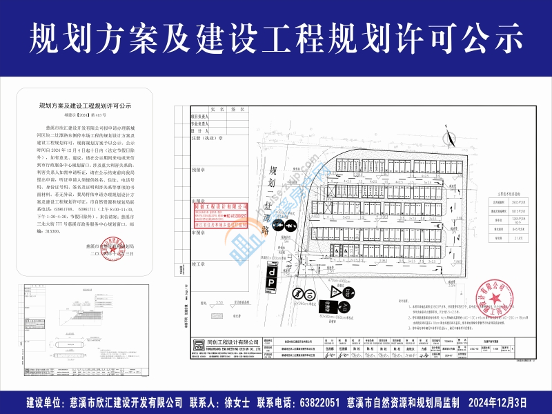 慈溪市欣汇建设开发有限公司拟申请办理新城河区块二灶潭路东侧停车场工程的规划设计方案及建设工程规划许可,现将规划方案予以公示。公示时间自2024年12月4日起十日内(法定节假日除外),如有意见、建议,请在公示期间来电或来信到市行政服务中心规划窗口。涉及重大利害关系的,利害关系人如需申请听证,请在公示结束前向我局提出申请,听证申请人须提供姓名、住址、电话号码、身份证号码、签名及证明利害关系等事项的书面材料。若无异议,我局将依申请办理规划设计方案及建设工程规划许可证。市自然资源和规划局联系电话:63961748、 63961711(上午8:00-11:30,下午1:30-4:30,节假日除外),来信请寄:慈溪市三北大街777号慈溪市政务服务中心规划窗口,邮编:315300。