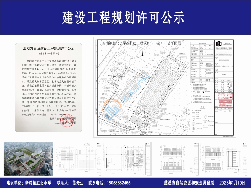 新浦镇胜北小学拟申请办理新浦镇胜北小学改扩建工程的规划设计方案及建设工程规划许可,现将规划方案予以公示。公示时间自2025年1月11日起十日内(法定节假日除外),如有意见、建议,请在公示期间来电或来信到市行政服务中心规划窗口。涉及重大利害关系的,利害关系人如需申请听证,请在公示结束前向我局提出申请,听证申请人须提供姓名、住址、电话号码、身份证号码、签名及证明利害关系等事项的书面材料。若无异议,我局将依申请办理规划设计方案及建设工程规划许可证。市自然资源和规划局联系电话:63961748、 63961711(上午8:00-11:30,下午1:30-4:30,节假日除外),来信请寄:慈溪市三北大街777号慈溪市政务服务中心规划窗口,邮编:315300。