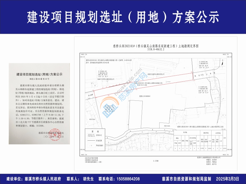 慈溪市桥头镇人民政府拟申请办理桥头镇吴山南路东延新建工程的规划选址(用地),拟选址(用地)地块地址:桥头镇日旺工业区。公示时间自2025年3月4日起十日内(法定节假日除外),如对该选址(用地)方案有意见、建议,请在公示期间来电或来信到市自然资源和规划局。若无异议,我局将依申请办理选址意见书及建设用地规划许可证。市自然资源和规划局联系电话:63961711、63961746(上午8:00-11:30,下午1:30-4:30,节假日除外),来信请寄:慈溪市三北大街777号慈溪市行政服务中心自然资源和规划窗口,邮编:315300。