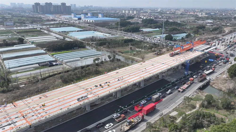 为顺利完成此次施工任务,项目部提前谋划、制定专项方案、安排专人专管。自1月15日首片梁板精准落位以来,克服不利天气等因素,各参建团队协同合作,确保了梁板架设整体过程安全、平稳、有序,圆满完成96榀小箱梁架设任务。“目前,该区域已进入桥面铺装施工阶段。接下来,将加快地面施工进程,尽早开放地面交通。”慈溪中横线快速路(二期)项目副总工朱跃昌介绍到。