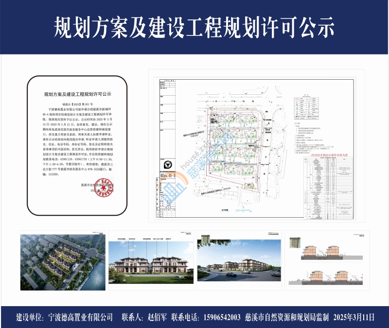 宁波德高置业有限公司拟申请办理慈溪市新城河46-A地块项目的规划设计方案及建设工程规划许可审批,现将相关资料予以公示。公示时间自2025年3月12日-2025年3月21日,如有意见、建议,请在公示期间来电或来信到市政务服务中心自然资源和规划窗口。涉及重大利害关系的,利害关系人如需申请听证,请在公示结束前向我局提出申请,听证申请人须提供姓名、住址、电话号码、身份证号码、签名及证明利害关系等事项的书面材料。若无异议,我局将依申请办理规划设计方案及建设工程规划许可证。市自然资源和规划局联系电话:63961126、63961739(上午8:00-11:30,下午1:30-4:30,节假日除外),来信请寄:慈溪市三北大街777号慈溪市政务服务中心97#-101#窗口,邮编:315300。