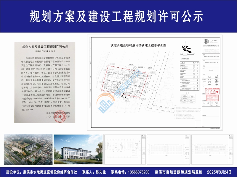 慈溪市坎墩街道直塘股份经济合作社拟申请办理坎墩街道直塘村惠民楼新建工程的规划方案及建设工程规划许可,现将规划方案予以公示。公示时间自2025年3月25日起十日内(法定节假日除外),如有意见、建议,请在公示期间来电或来信到市行政服务中心规划窗口。涉及重大利害关系的,利害关系人如需申请听证,请在公示结束前向我局提出申请,听证申请人须提供姓名、住址、电话号码、身份证号码、签名及证明利害关系等事项的书面材料。若无异议,我局将依申请办理规划设计方案及建设工程规划许可证。市自然资源和规划局联系电话:63961748、 63961711(上午8:00-11:30,下午1:30-4:30,节假日除外),来信请寄:慈溪市三北大街777号慈溪市政务服务中心规划窗口,邮编:315300。