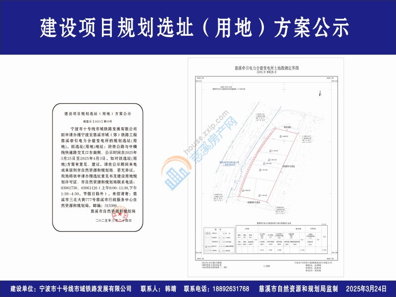 宁波市十号线市域铁路发展有限公司拟申请办理宁波至慈溪市域(郊)铁路工程慈溪牵引电力合建变电所的规划选址(用地),拟选址(用地)地址:浒崇公路与中横线快速路交叉口东南侧。公示时间自2025年3月25日至2025年4月3日,如对该选址(用地)方案有意见、建议,请在公示期间来电或来信到市自然资源和规划局。若无异议,我局将依申请办理选址意见书及建设用地规划许可证。市自然资源和规划局联系电话:63961739、63961126(上午8:00-11:30,下午1:30-4:30,节假日除外),来信请寄:慈溪市三北大街777号慈溪市行政服务中心自然资源和规划局,邮编:315300。