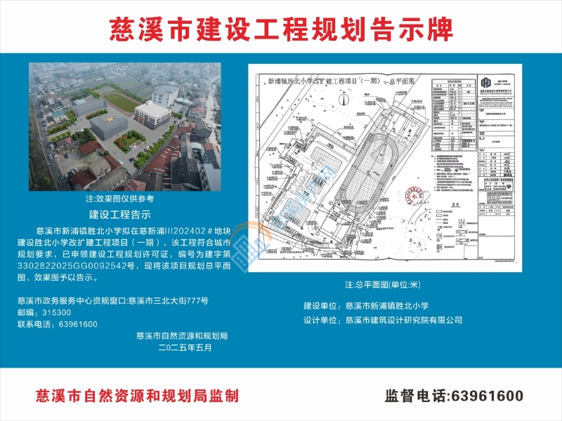 慈溪市新浦镇胜北小学拟在新浦镇荣誉村建设新浦镇胜北小学改扩建工程项目(一期)项目,该工程符合城市规划要求,已申领建设工程规划许可证,编号为建字第3302822025GG0092542号,现将该项目规划总平面图、效果图予以告示。