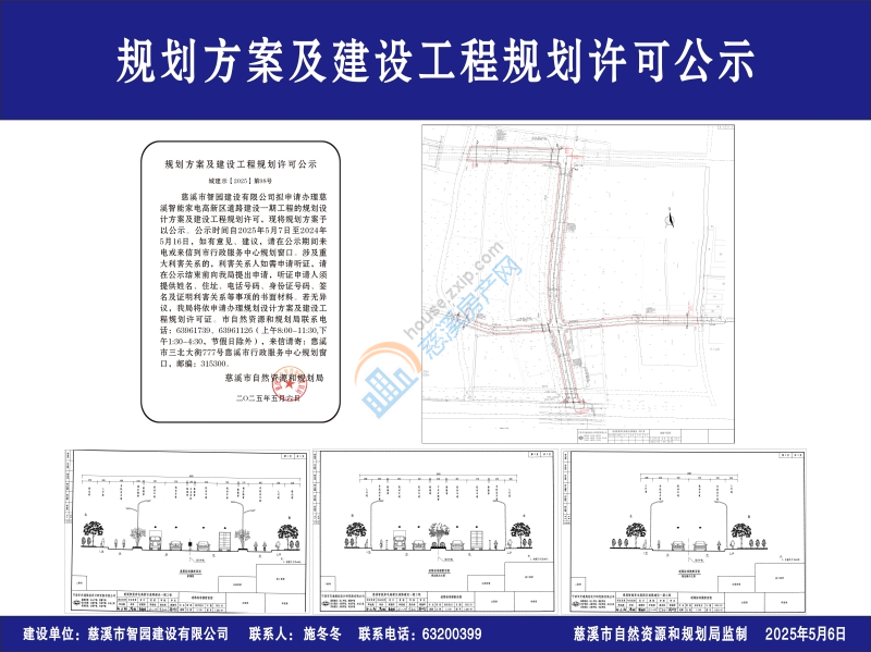 慈溪市智园建设有限公司拟申请办理慈溪智能家电高新区道路建设一期工程的规划设计方案及建设工程规划许可,现将规划方案予以公示。公示时间自2025年5月7日至2024年5月16日,如有意见、建议,请在公示期间来电或来信到市行政服务中心规划窗口。涉及重大利害关系的,利害关系人如需申请听证,请在公示结束前向我局提出申请,听证申请人须提供姓名、住址、电话号码、身份证号码、签名及证明利害关系等事项的书面材料。若无异议,我局将依申请办理规划设计方案及建设工程规划许可证。市自然资源和规划局联系电话:63961739、63961126(上午8:00-11:30,下午1:30-4:30,节假日除外),来信请寄:慈溪市三北大街777号慈溪市行政服务中心规划窗口,邮编:315300。
