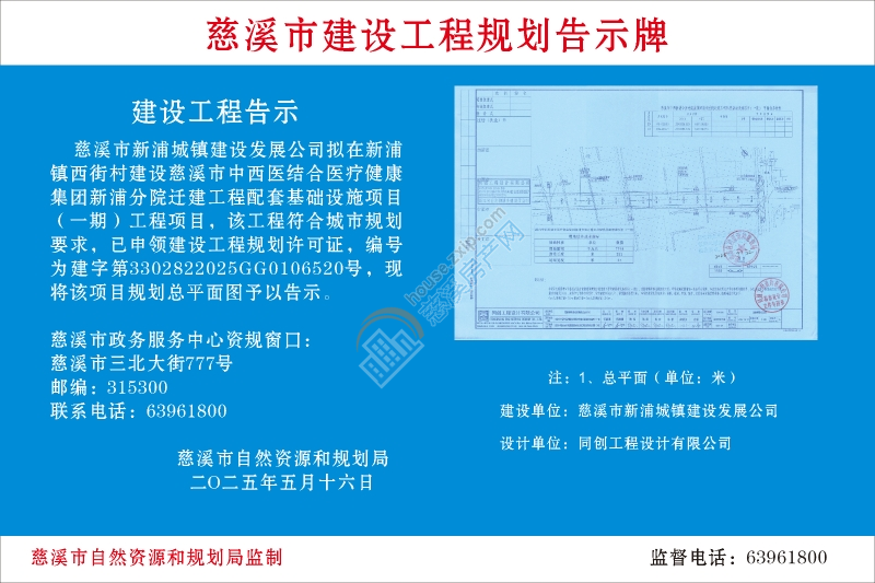 慈溪市新浦城镇建设发展公司拟在新浦镇西街村建设慈溪市中西医结合医疗健康集团新浦分院迁建工程配套基础设施项目(一期)工程项目,该工程符合城市规划要求,已申领建设工程规划许可证,编号为建字第3302822025GG0106520号,现将该项目规划总平面图、效果图予以告示。