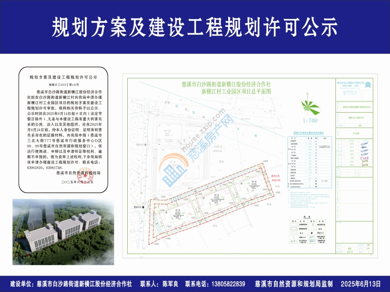 慈溪市白沙路街道新横江股份经济合作社拟在白沙路街道新横江村向我局申请办理新横江村工业园区项目的规划方案及建设工程规划许可审批,现将相关资料予以公示。公示时间自2025年6月14日起十日内(法定节假日除外),凡是与本建设工程有重大利害关系的公民、法人以及其他组织,应在2025年月6月24日前,持本人身份证明、证明有利害关系存在的证据材料,向我局申报(慈溪市三北大街777号慈溪市行政服务中心D区98、99号慈溪市自然资源和规划窗口),依法行使陈述、申辩以及申请听证等权利。逾期不申报的,视为放弃上述权利,下步我局将依申请办理建设工程规划许可。联系电话:63961810,63961748。