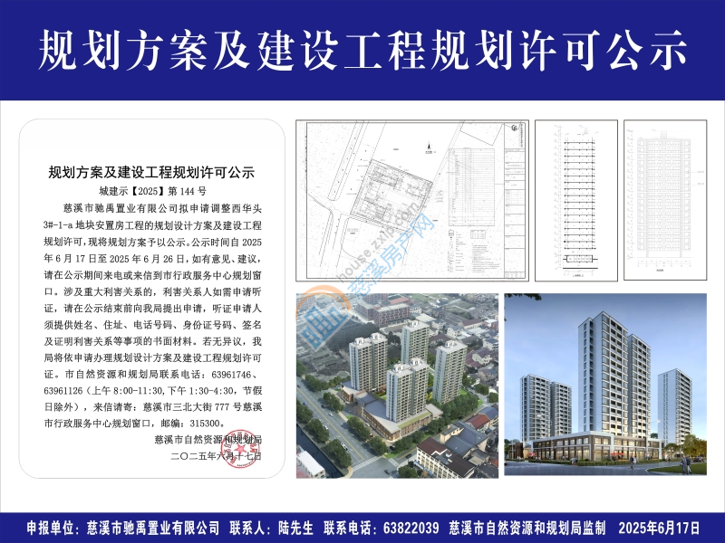 慈溪市驰禹置业有限公司拟申请调整西华头3#-1-a地块安置房工程的规划设计方案及建设工程规划许可,现将规划方案予以公示。公示时间自2025年6月17日至2025年6月26日,如有意见、建议,请在公示期间来电或来信到市行政服务中心规划窗口。涉及重大利害关系的,利害关系人如需申请听证,请在公示结束前向我局提出申请,听证申请人须提供姓名、住址、电话号码、身份证号码、签名及证明利害关系等事项的书面材料。若无异议,我局将依申请办理规划设计方案及建设工程规划许可证。市自然资源和规划局联系电话:63961746、63961126(上午8:00-11:30,下午1:30-4:30,节假日除外),来信请寄:慈溪市三北大街777号慈溪市行政服务中心规划窗口,邮编:315300。