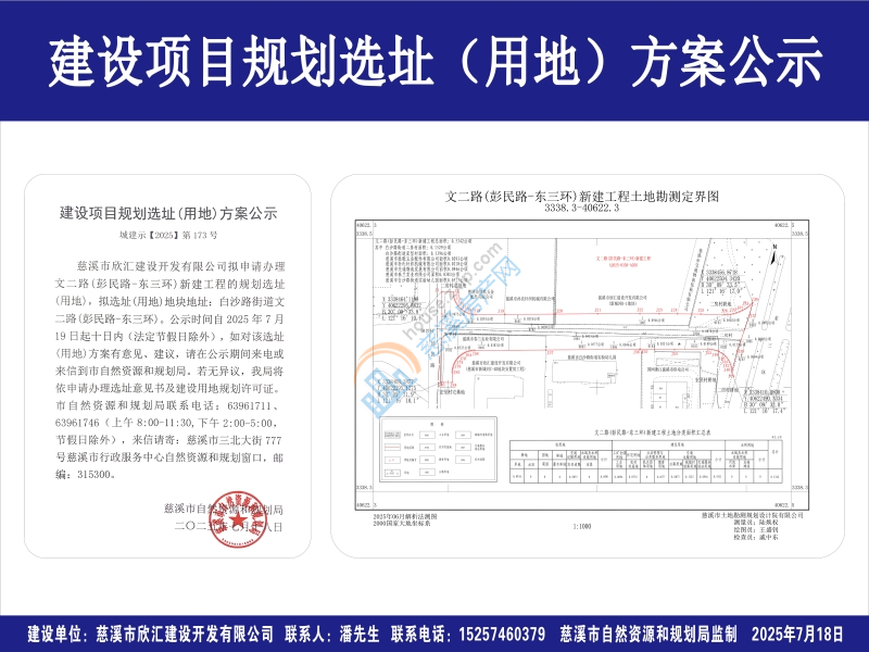 慈溪市欣汇建设开发有限公司拟申请办理文二路(彭民路-东三环)新建工程的规划选址(用地),拟选址(用地)地块地址:白沙路街道文二路(彭民路-东三环)。公示时间自2025年7月19日起十日内(法定节假日除外),如对该选址(用地)方案有意见、建议,请在公示期间来电或来信到市自然资源和规划局。若无异议,我局将依申请办理选址意见书及建设用地规划许可证。市自然资源和规划局联系电话:63961711、63961746(上午8:00-11:30,下午2:00-5:00,节假日除外),来信请寄:慈溪市三北大街777号慈溪市行政服务中心自然资源和规划窗口,邮编:315300。