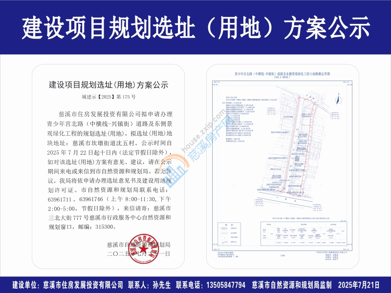 慈溪市住房发展投资有限公司拟申请办理青少年宫北路(中横线-兴镇街)道路及东侧景观绿化工程的规划选址(用地),拟选址(用地)地块地址:慈溪市坎墩街道沈五村。公示时间自2025年7月22日起十日内(法定节假日除外),如对该选址(用地)方案有意见、建议,请在公示期间来电或来信到市自然资源和规划局。若无异议,我局将依申请办理选址意见书及建设用地规划许可证。市自然资源和规划局联系电话:63961711、63961746(上午8:00-11:30,下午2:00-5:00,节假日除外),来信请寄:慈溪市三北大街777号慈溪市行政服务中心自然资源和规划窗口,邮编:315300。