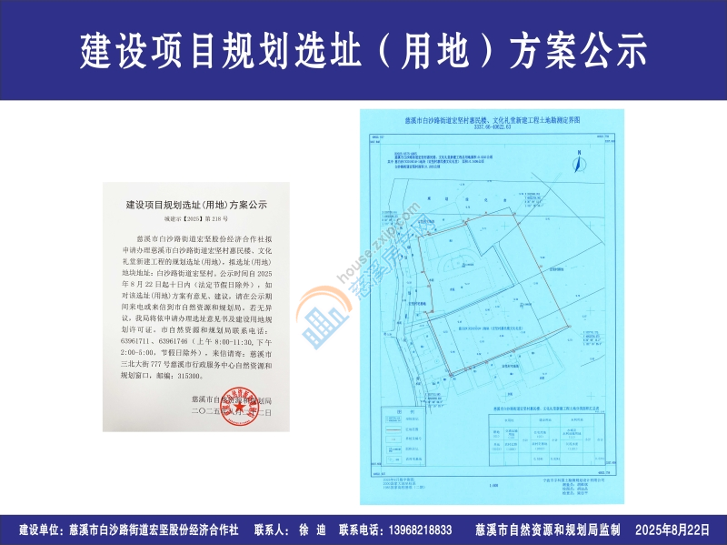 慈溪市白沙路街道宏坚股份经济合作社拟申请办理慈溪市(用地),拟选址(用地)地块地址:白沙路街道宏坚村。公示时间自2025年8月22日起十日内(法定节假日除外),如对该选址(用地)方案有意见、建议,请在公示期间来电或来信到市自然资源和规划局。若无异议,我局将依申请办理选址意见书及建设用地规划许可证。市自然资源和规划局联系电话:63961711、63961746(上午8:00-11:30,下午2:00-5:00,节假日除外),来信请寄:慈溪市三北大街777号慈溪市行政服务中心自然资源和规划窗口,邮编:315300。