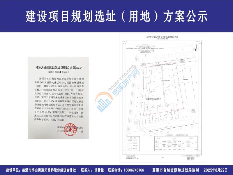 慈溪市浒山街道天香桥股份经济合作社拟申请办理天香桥文化活动中心项目的规划选址(用地),拟选址(用地)地块地址:浒山街道天香桥村。公示时间自2025年8月22日起十日内(法定节假日除外),如对该选址(用地)方案有意见、建议,请在公示期间来电或来信到市自然资源和规划局。若无异议,我局将依申请办理选址意见书及建设用地规划许可证。市自然资源和规划局联系电话:63961711、63961746(上午8:00-11:30,下午2:00-5:00,节假日除外),来信请寄:慈溪市三北大街777号慈溪市行政服务中心自然资源和规划窗口,邮编:315300。
