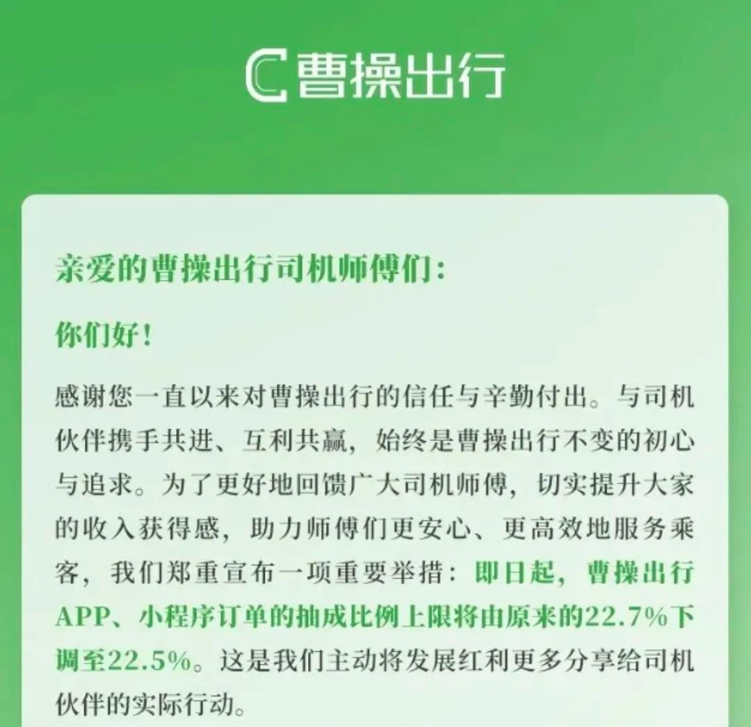 曹操出行则表示,将APP、小程序订单的抽成比例上限将由原来的22.7%下调至22.5%。