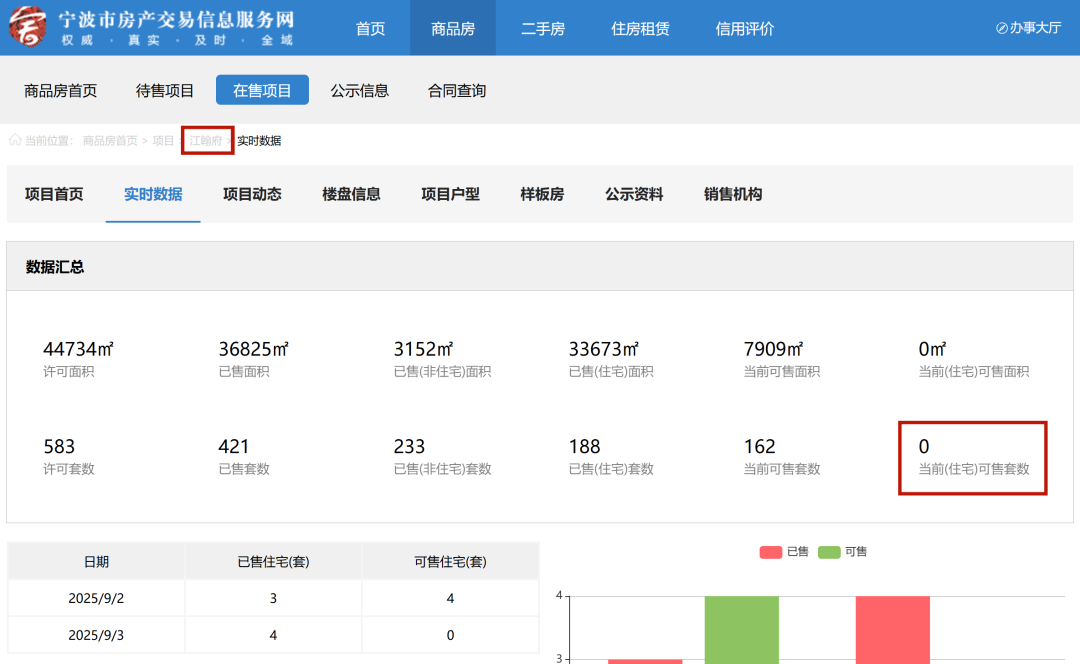 江翰府剩余未网签的可售住宅套数。 截图自宁波市房产交易信息服务网