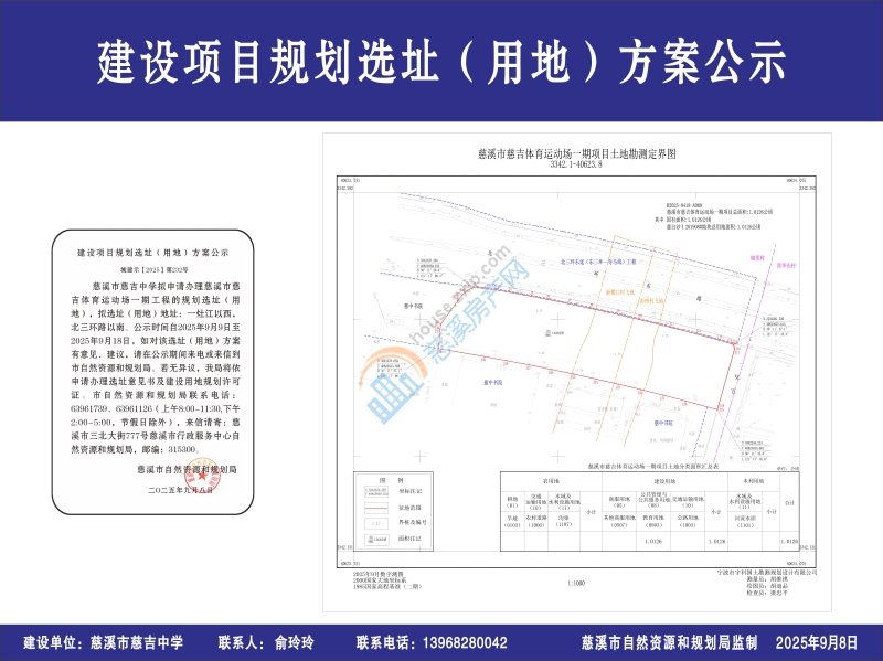 慈溪市慈吉中学拟申请办理慈溪市慈吉体育运动场一期工程的规划选址(用地),拟选址(用地)地址:一灶江以西,北三环路以南。公示时间自2025年9月9日至2025年9月18日,如对该选址(用地)方案有意见、建议,请在公示期间来电或来信到市自然资源和规划局。若无异议,我局将依申请办理选址意见书及建设用地规划许可证。市自然资源和规划局联系电话:63961739、63961126(上午8:00-11:30,下午2:00-5:00,节假日除外),来信请寄:慈溪市三北大街777号慈溪市行政服务中心自然资源和规划局,邮编:315300。