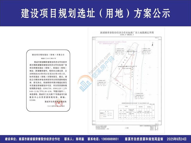 慈溪市新浦镇荣誉股份经济合作社拟申请办理新浦镇荣誉股份经济合作社标准厂房项目的规划选址(用地),拟选址(用地)地址:新浦镇荣誉村,现状水云浦以西。公示时间自2025年9月25日至2025年10月11日,如对该选址(用地)方案有意见、建议,请在公示期间来电或来信到市自然资源和规划局。若无异议,我局将依申请办理选址意见书及建设用地规划许可证。市自然资源和规划局联系电话:63961739、63961126(上午8:00-11:30,下午1:30-4:30,节假日除外),来信请寄:慈溪市三北大街777号慈溪市行政服务中心自然资源和规划局,邮编:315300。