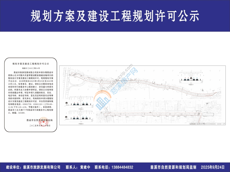 慈溪市旅游发展有限公司拟申请办理慈溪市翠屏山北乡村振兴共富带建设配套基础设施项目的规划设计方案及建设工程规划许可,现将规划方案予以公示。公示时间自2025年9月25日至2025年10月11日,如有意见、建议,请在公示期间来电或来信到市行政服务中心规划窗口。涉及重大利害关系的,利害关系人如需申请听证,请在公示结束前向我局提出申请,听证申请人须提供姓名、住址、电话号码、身份证号码、签名及证明利害关系等事项的书面材料。若无异议,我局将依申请办理规划设计方案及建设工程规划许可证。市自然资源和规划局联系电话:63961739、63961126(上午8:00-11:30,下午1:20-4:30,节假日除外),来信请寄:慈溪市三北大街777号慈溪市行政服务中心规划窗口,邮编:315300。