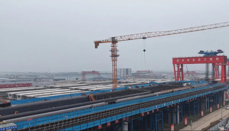 深秋的晨光下,吊车缓缓移动,将最后一组深蓝色的贝雷片精准吊装至支架横梁上。10月31日,在通苏嘉甬高铁项目慈溪特大桥374-375#墩的施工现场,随着这片关键构件的稳稳就位,现场响起一阵热烈的掌声,这标志着由中铁北京局承建的通甬项目一分部负责的8联道岔连续梁支撑架已全部搭设完成。这批总重达5700吨的巨型“钢铁骨架”在慈溪大地上全线贯通,为后续大规模的梁体混凝土浇筑铺平了道路,项目建设自此全面转入梁体施工新阶段。