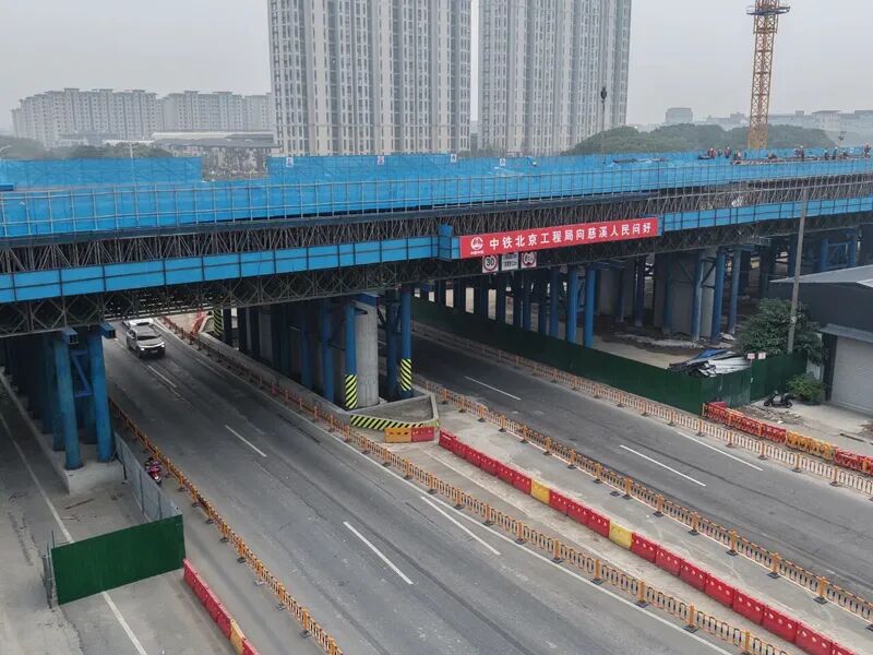 浒崇公路作为宽达40米的城市主干道,双向六车道,日间车流如织。施工方需要在此处架设包含四种不同梁型的复杂梁体支架,技术难度高,安全风险极大。为确保道路畅通与施工安全两不误,项目部进行了周密的部署。施工前,专项施工方案、安全防护方案及交通组织方案经过了监理、建设、专家及地方行政部门的多轮严格审核。施工期间,项目部积极与属地街道、交警部门联动,先后三次实施交通导改,通过有效的分流疏导,既保障了支架搭设的顺利进行,也最大限度地缓解了对城市交通的影响。