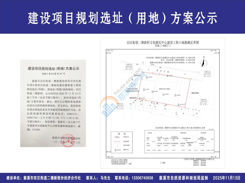 慈溪市宗汉街道二塘新股份经济合作社拟申请办理宗汉街道二塘新村惠民楼新建工程的规划选址(用地),拟选址(用地)地块地址:宗汉街道二塘新村。公示时间自2025年11月14日起十日内(法定节假日除外),如对该选址(用地)方案有意见、建议,请在公示期间来电或来信到市自然资源和规划局。若无异议,我局将依申请办理选址意见书及建设用地规划许可证。市自然资源和规划局联系电话:63961711、63961746(上午8:00-11:30,下午1:30-4:30,节假日除外),来信请寄:慈溪市三北大街777号慈溪市行政服务中心自然资源和规划窗口,邮编:315300。