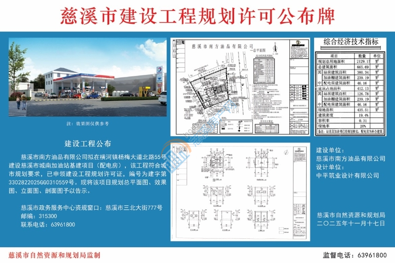 慈溪市南方油品有限公司拟在横河镇杨梅大道北路55号建设慈溪市城南加油站基建项目,该工程符合城市规划要求,已申领建设工程规划许可证,编号为建字第3302822025GG0310559号,现将该项目规划总平面图、效果图予以告示。
