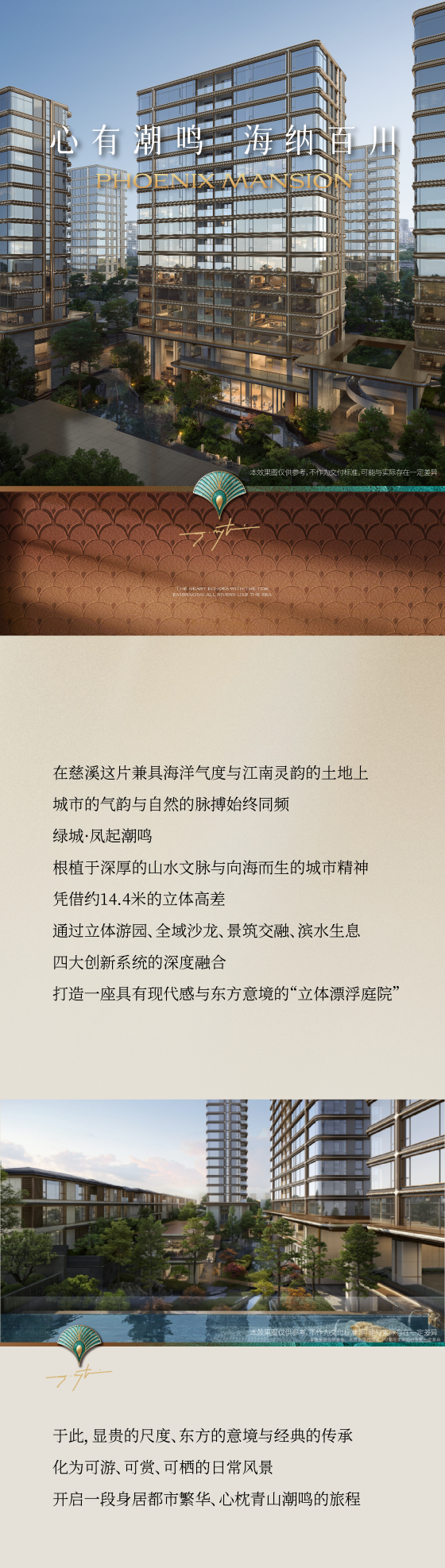 本宣传资料所有文字、数据、图片及所标尺寸不构成要约内容,相关内容不排除因政府相关规划、规定及其他原因发生变化,一切有关房屋的具体信息以书面合同及政府最终审批文件为准。本资料中教育设施的内容不作为学区承诺,具体学区划片、入学条件件及收费标准以政府教育主管部门的规划要求及学校招生政策为准。本资料发布时间为2026年1月12日,有效期5天。本项目推广案名为【凤起潮鸣】,核准地名为【慈溪凤起潮鸣邸】,开发商【慈溪市金慈置业有限公司】。绿城中国服务热线:95059。