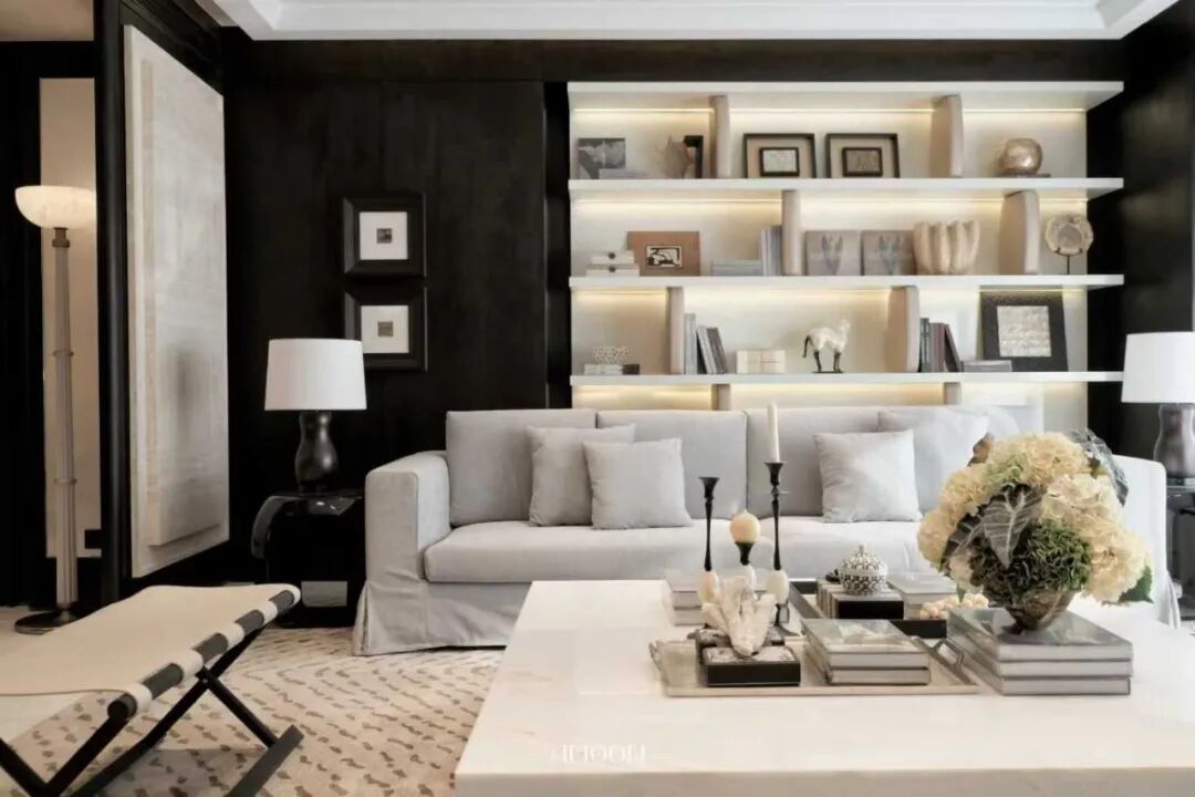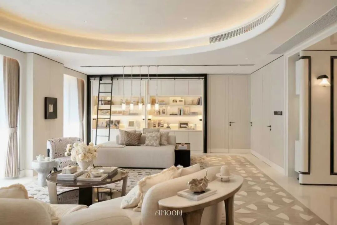 内部整体就像是一幅低饱和度的丝帛画。墙面大面积留白,并非空无一物,而是为未来居住者的生活痕迹与艺术收藏预留的负空间,家具的线条带有轻法式的繁复,在关键的转角处,运用了倒角与弧形的微妙处理,柔化了建筑的骨骼,让光线在其上流淌蜿蜒。