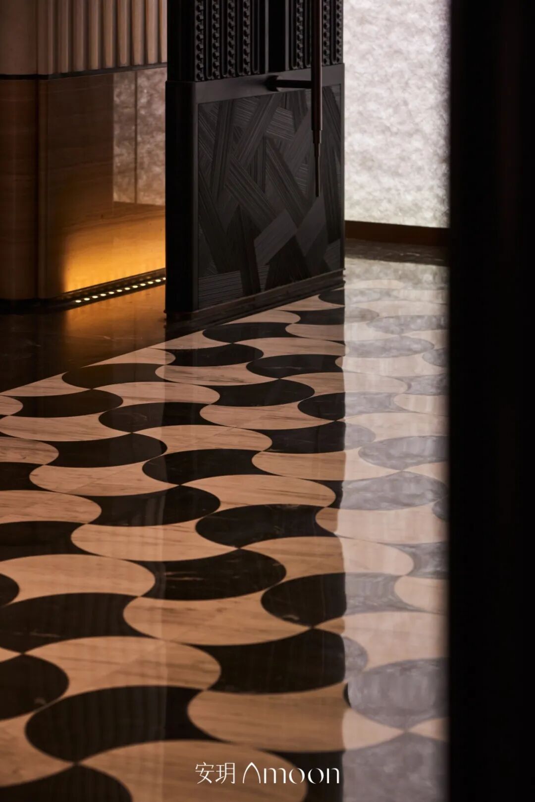 目光下移,地面选用黑白色大理石以超高精度水刀拼花工艺完成。每一片石材的切割与拼接都严丝合缝,形成的纹理脉络独一无二,成为自然天赋与人类极致工艺在毫米尺度上的永恒对话。