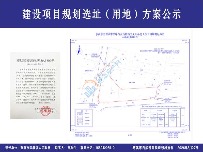 慈溪市匡堰镇人民政府拟申请办理匡堰镇中横路与走马塘路交叉口拓宽工程的规划选址(用地),拟选址(用地)地块地址:匡堰镇樟树村西河片区。公示时间自2026年3月27日起十日内(法定节假日除外),如对该选址(用地)方案有意见、建议,请在公示期间来电或来信到市自然资源和规划局。若无异议,我局将依申请办理选址意见书及建设用地规划许可证。市自然资源和规划局联系电话:63961711、63961746(上午8:00-11:30,下午1:30-4:30,节假日除外),来信请寄:慈溪市三北大街777号慈溪市行政服务中心自然资源和规划窗口,邮编:315300。