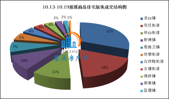 慈溪商品住宅各版块成交情况中,城区版块(浒山街道、古塘街道、白沙路街道、宗汉街道、坎墩街道)共成交47套,成交均价12007.81元/㎡,占总成交的42.73%。排名前三版块:龙山镇备案34套,占31%;宗汉街道备案20套,占18%;浒山街道备案12套,占11%。