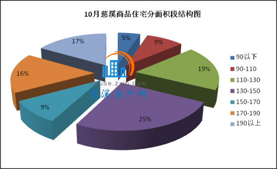 10月慈溪商品住宅分面积段成交中,130-150㎡面积段为最热门户型,共计124套,成交均价8098元/㎡,占总成交套数的25%;110-130㎡面积段产品成交91套,成交均价6723元/㎡,占总成交套数的19%,销量排名第二;190㎡以上面积段产品成交81套,成交均价13835元/㎡,占总成交套数的17%,销量排名第三。