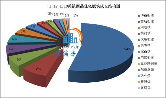 慈溪商品住宅各版块成交情况中,城区版块(浒山街道、古塘街道、白沙路街道、宗汉街道、坎墩街道)共成交124套,成交均价9427.37元/㎡。排名前三版块:浒山街道备案92套,占54%;古塘街道备案13套,占8%;周巷镇备案11套,占6%。