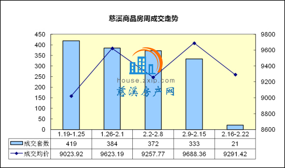 慈溪上周(2.16-2.22)成交各类房源(含住宅、公寓、商铺、写字楼和车库)共计21套,成交均价9291.42元/㎡,成交面积2054方。环比上上周成交量下跌93.69%,成交均价下跌4.10%,成交面积下跌93.62%。