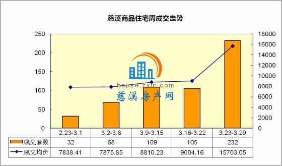 慈溪上周(3.23-3.29)成交各类房源(含住宅、公寓、商铺、写字楼和车库)共计662套,成交均价14577.68元/㎡,成交面积64323方。环比上上周成交量上涨338.41%,成交均价上涨50.99%,成交面积上涨300.69%。