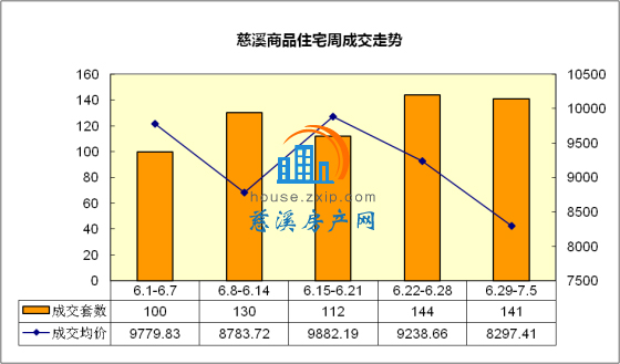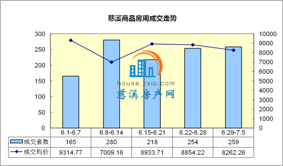 楼市进入7月,传统淡季开始,但慈溪市场首周表现依旧强劲,上周(6.29-7.5)成交各类房源(含住宅、公寓、商铺、写字楼和车库)共计259套,成交均价8262.26元/㎡,成交面积23929方。环比上上周成交量上涨1.97%,成交均价下跌6.69%,成交面积下跌9.99%。