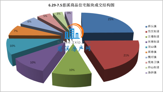 慈溪商品住宅(含别墅)各版块成交情况中,城区版块(浒山街道、古塘街道、白沙路街道、宗汉街道、坎墩街道)共成交62套,成交均价10781.45元/㎡。排名前三版块:桥头镇备案35套,占25%;宗汉街道备案29套,占21%;古塘街道、坎墩街道与龙山镇各备案14套,各占10%。