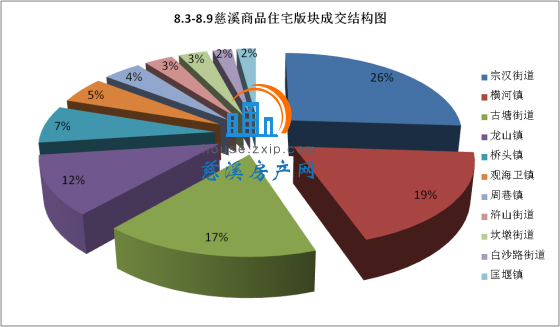 慈溪商品住宅(含别墅)各版块成交情况中,城区版块(浒山街道、古塘街道、白沙路街道、宗汉街道、坎墩街道)共成交49套,成交均价10658.91元/㎡。排名前三版块:宗汉街道备案25套,占26%;横河镇备案18套,占19%;古塘街道备案16套,占17%。