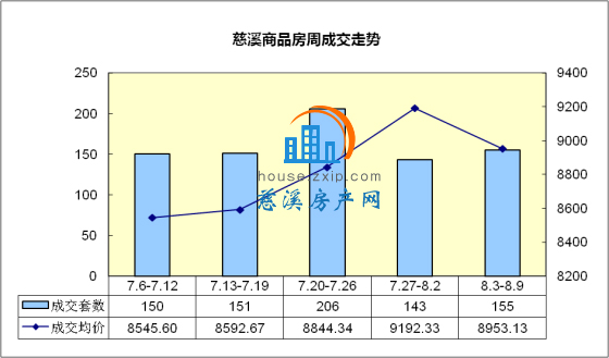 上周(8.3-8.9)成交各类房源(含住宅、公寓、商铺、写字楼和车库)共计155套,成交均价8953.13元/㎡,成交面积19095方。环比上上周成交量上涨8.39%,成交均价下跌2.60%,成交面积上涨12.69%。