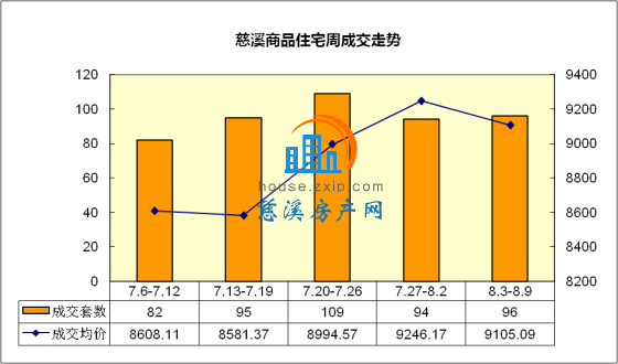 慈溪楼市成交量在上上周下降的基础上有所提升但涨幅不大,成交均价略有下降,总体较为平稳。上周,台风“苏迪罗”来袭,但依旧阻挡不了开发商们的热情,各楼盘活动精彩继续。8月8日,保利地产·和乐中国——第七届和乐大赛慈溪选拔赛总决赛在保利滨湖天地售楼中心火热举行;8月9日,绿城御园举办亲子DIY活动,各色多肉等您认领;8月9日,绿城诚园继续龙虾啤酒嘉年华。